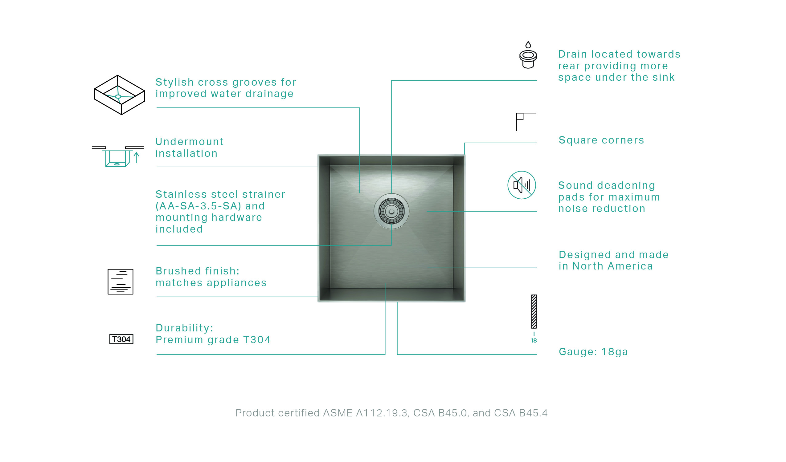 • UNDERMOUNT INSTALLATION: Undermount sinks are usually installed underneath a solid piece of countertop material. This installation allows to easily wipe water and crumbs into sink without getting caught between the sink edge and the countertop. It also has the advantage to create a clean look.