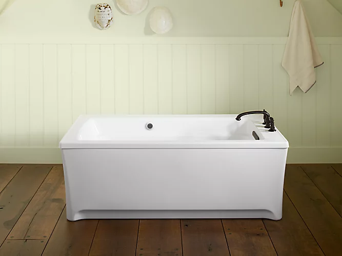 Taking its design cues from traditional Craftsman furniture, the Archer line of baths reveals beveled edges and curved bases for a clean, sophisticated style. This Archer freestanding bath gently supports the natural curves of your body, while the Bask heated surface warms your back and neck with adjustable temperature settings to create a soothing, spa-like environment. This bath also offers versatility in faucet selection as you can deck-mount faucets or use a floor-mounted filler.