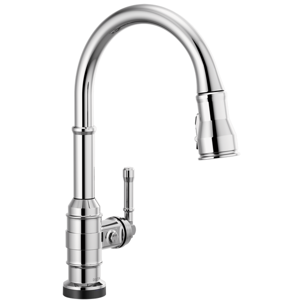 The powerful features of the Broderick™ Collection take center stage in the kitchen, with an industrial style that alludes to a rich heritage. The collection includes distinctive bridge faucet and pull-down spring spout faucet options that add a unique element to any kitchen. Styled after the rugged nuts and bolts of machinery, it serves as a true centerpiece in the kitchen. Touch it on. Touch it off. Whether you have two full hands or 10 messy fingers, Delta® Touch2O® Technology helps keep your kitchen faucet clean, even when your hands aren’t. A simple touch anywhere on the spout or handle with your wrist or forearm activates the flow of water at the temperature where your handle is set. The Delta TempSense™ LED light changes color to alert you to the water’s temperature and eliminates any possible surprises or discomfort. Kitchen sink faucets with Touch-Clean® Spray Holes allow you to easily wipe away calcium and lime build-up with the touch of a finger. Delta® ShieldSpray® Technology cleans with laser-like precision while containing mess and splatter. A concentrated jet powers away stubborn messes while an innovative shield of water contains splatter and clears off the mess, so you can spend less time soaking, scrubbing and shirt swapping. Delta® kitchen faucets with DIAMOND™ Seal Technology perform like new for life with a patented design which reduces leak points, is less hassle to install and lasts twice as long as the industry standard*. Kitchen sink faucets with Touch-Clean® Spray Holes allow you to easily wipe away calcium and lime build-up with the touch of a finger. You can install with confidence, knowing that Delta kitchen faucets are backed by our Lifetime Limited Warranty. Electronic parts are backed by our 5-year electronic parts warranty. *Industry standard is based on ASME A112.18.1 of 500,000 cycles.