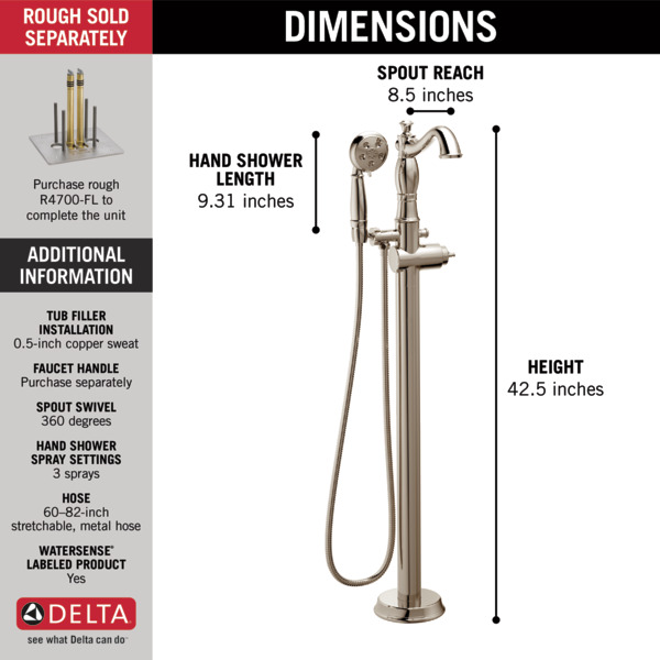 Complete your bath with a beautifully designed Delta roman tub faucet, meticulously crafted to turn heads and enhance your experience. The included hand shower makes this a versatile addition to your bath, perfect for rinsing off, washing loved ones and pets or keeping your tub clean. Delta® H2Okinetic® Hand Showers look different because they are different. Using advanced technology, H2Okinetic Hand Showers sculpt water into a unique wave pattern, giving you 3X the coverage of a standard shower head.* The end result is a hand shower that provides more coverage, more warmth and more intensity for a truly drenching experience. Designed to look like new for life, Brilliance® finishes are developed using a proprietary process that creates a durable, long-lasting finish that is guaranteed not to corrode, tarnish or discolor. This glossy finish provides a delicate elegance that can make almost any room pop. The polished surface reflects back deep shadows from your space, creating contrast within the pale gold tones which takes on a new light from every angle. Brilliance finishes are durable, long-lasting and guaranteed not to corrode, tarnish or discolor, so you can enjoy a coordinated bath you'll love to look at for life. You can install with confidence, knowing that Delta faucets are backed by our Lifetime Limited Warranty. *Coverage measured in accordance with EPA WaterSense® Specification for shower heads, March 4, 2010.