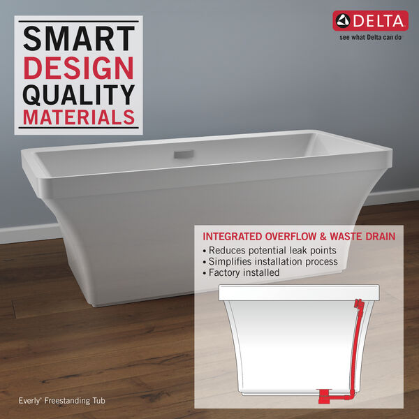 Immerse yourself in a deeply relaxing soak with the Delta Everly® Freestanding Bathtub. Constructed from lightweight, durable acrylic material, this soaking tub helps to create a tranquil bathing experience and is easy to clean and maintain. The factory-installed integrated overflow and waste drain helps to reduce potential leak points and simplify the installation process. Also available in the larger 67 in. X 36 in. for even more soaking room. Coordinates with the Everly bath collection.