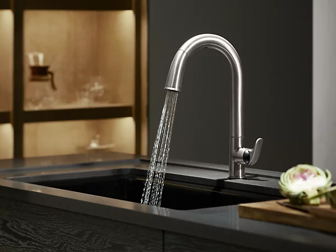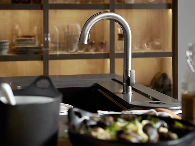 ake touchless to a whole new level of convenience. The Sensate touchless faucet frees your hands so you can speed through cooking and cleanup tasks while enjoying a cleaner, more hygienic kitchen environment. Sensate's intuitive Response technology is in tune with your every move: a simple wave of your hand-or an object such as a pan or utensil-turns it on or off. The faucet's sensor is precision-designed to provide reliable operation every time and to prevent false activations when you're working in the sink area. Kohler's new docking system, DockNetik, secures the pull-down sprayhead to the spout using magnetic force.