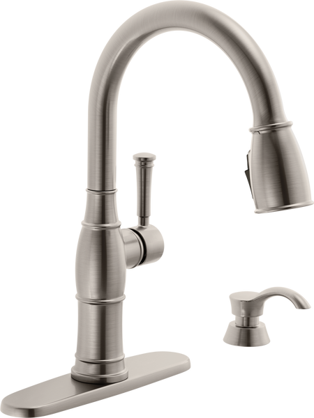 Valdosta® Single Handle Pull-Down Kitchen Faucet With Soap Dispenser And ShieldSpray® Technology In Spotshield Stainless MODEL#: 19957Z-SPSD-DST-brand